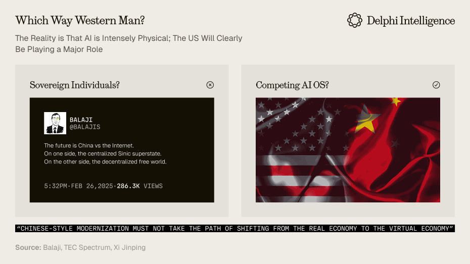 Despite having libertarian sympathies, I’ve become more... practical in my late years as an anthropomorphic fruit. @Balaji’s the-west-is-being-subsumed-into-the-internet thesis is interesting but fails to consider the intensely physical nature of AI: the energy requirements, the fabs, the data centers, the robots - all rooted in physical jurisdictions, manned by men with guns.