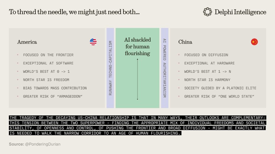 “The tragedy of the decaying US-China Relationship is that, in many ways, their outlooks are complementary: this tension between the two superpowers - finding the appropriate mix of individual freedoms and societal stability, of openness and control, of pushing the frontier and broad diffusion - might be exactly what is needed to walk the narrow corridor to an age of human flourishing.”