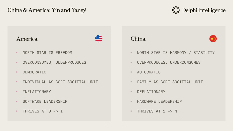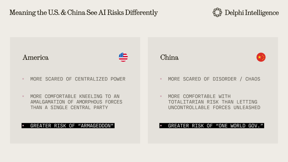 The tragedy of the decaying US-China relationship is that, in many ways, their outlooks are complementary. The US prioritizes freedom. China prioritizes societal harmony. The U.S. fears centralized control. The Chinese fear chaos. The U.S. risks runaway techno-capitalism. China risks techno-authoritarianism. In the Thielian sense, the US has a bias towards “Armageddon”. China has a bias towards “Anti-Christ”.