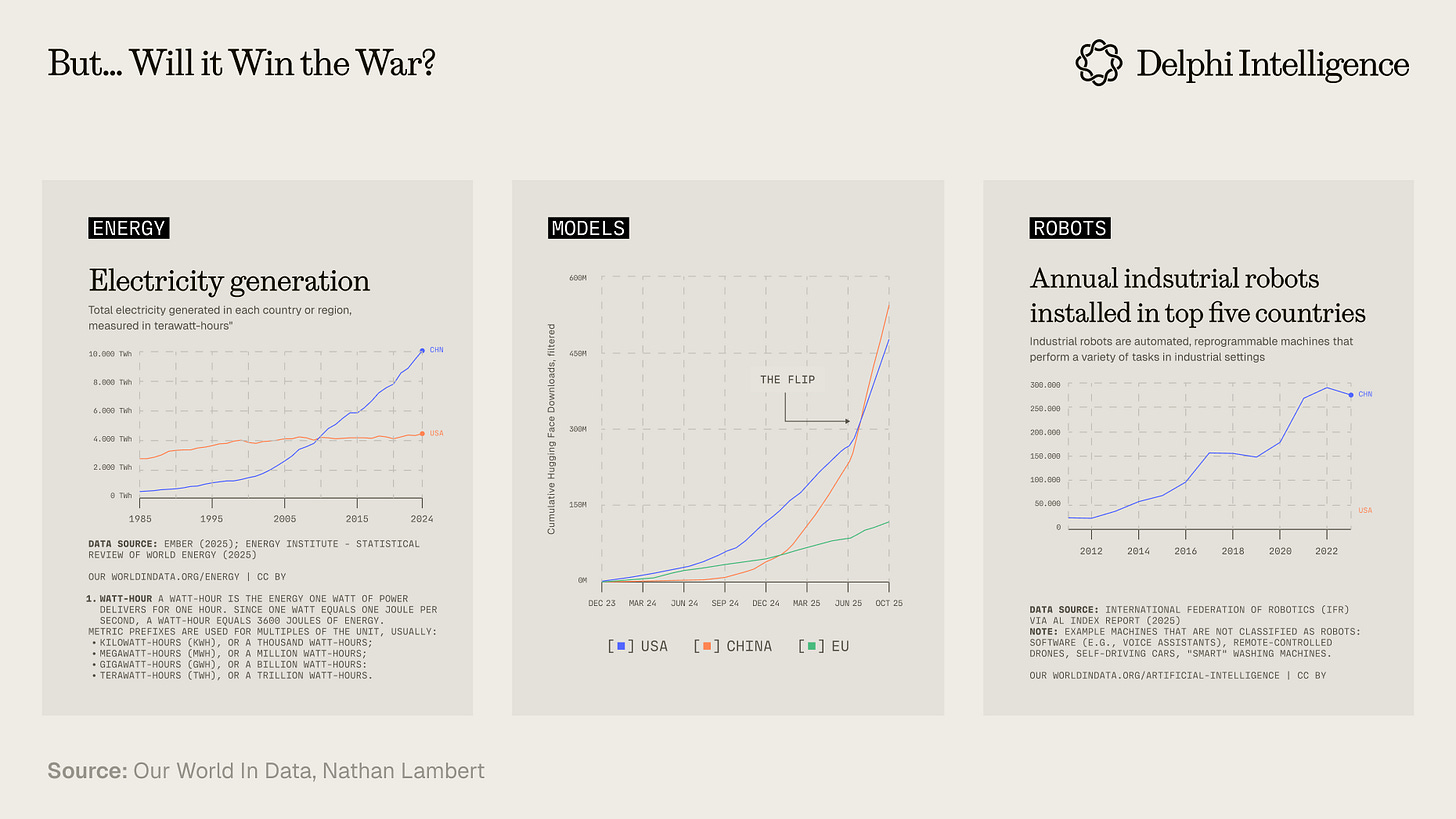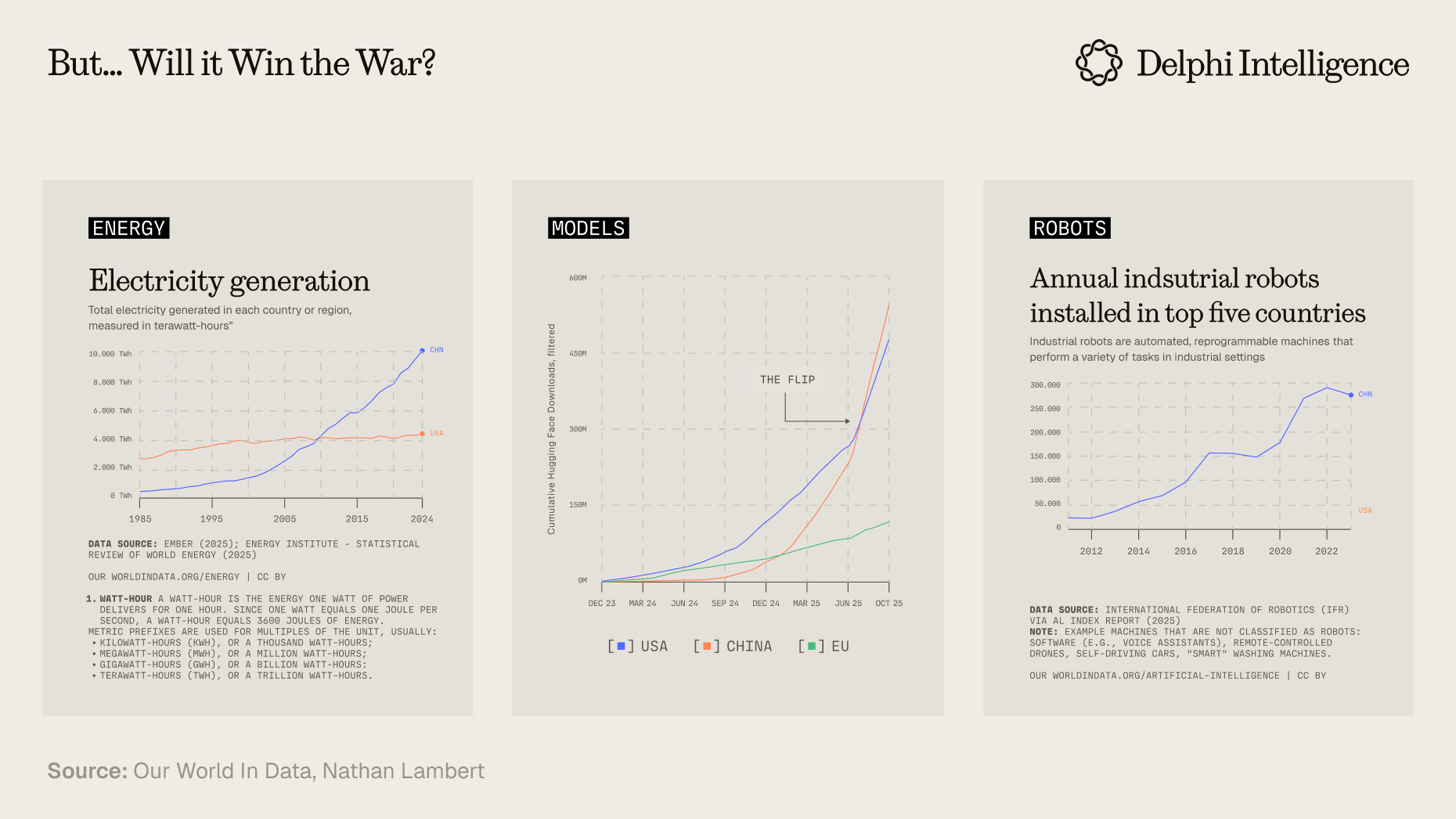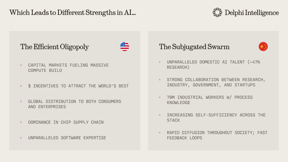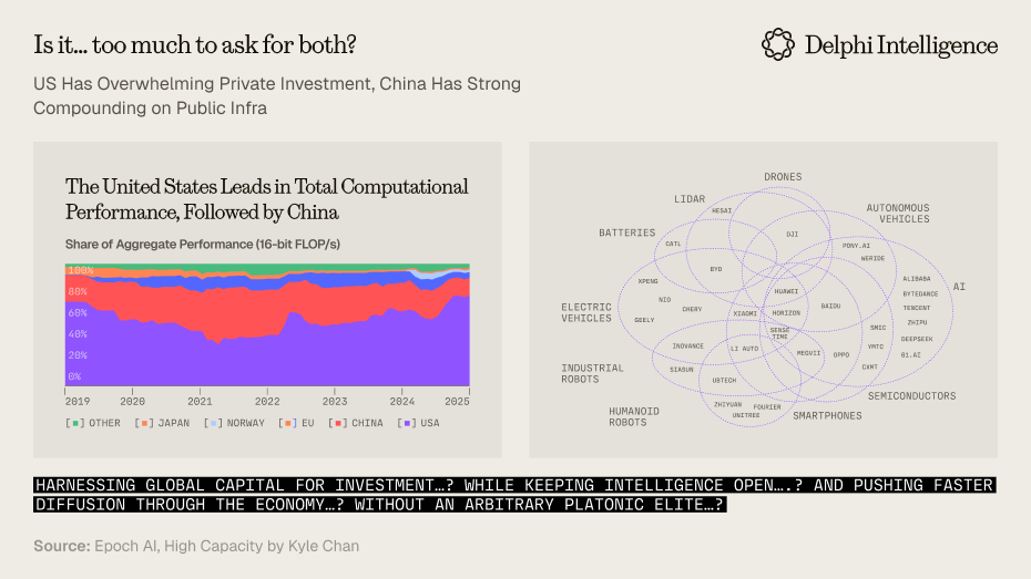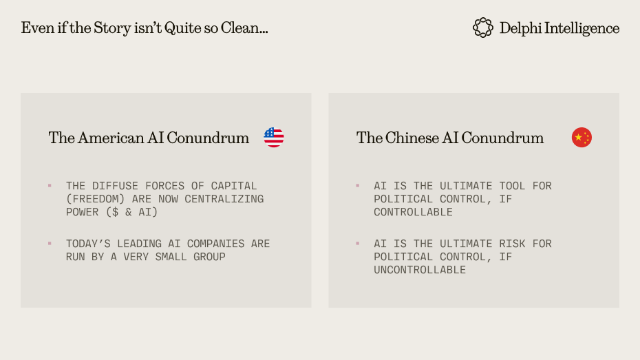 The goal is to make digital intelligence a commodity: powering robotics to assuage demographics, AI tutors to reduce the education gap, effective surveillance to ensure domestic control, dark factories which keeps manufacturing on shore as China’s wages rise. The end vision of China is leveraging intelligence not for profit, but for state-directed aims: underpinning the CCPs vision of a stable and harmonious society and reducing external dependencies.