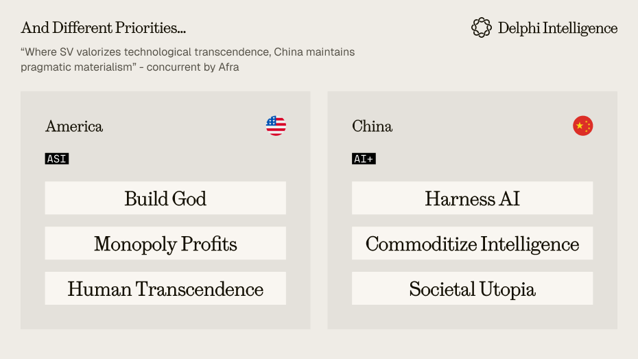 The US, aligned with its cultural DNA, remains focused on pushing the frontier. The, often explicit, goal of the US labs is superintelligence - emphasizing breakthroughs in science, medicine, energy, exploration and more. The approach involves greater existential risk. It also involves trillions in capex, funded in anticipation of some level of monopolistic or oligopolistic profits in the future. The end goal again appears more focused on the individual, a merging with the machine to overcome our biological limitations. To become God’s.