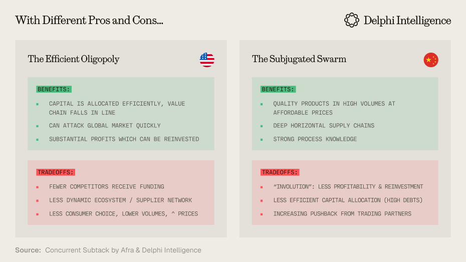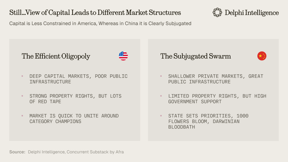 Still, the relative bias has led to different market structures between the two tech ecosystems - the U.S. is fairly oligopolistic, power-laws quickly forming behind private winners which grow extremely large, very quickly, and China which has “deep infrastructure” but less robust capital markets leading to a subjugated swarm: