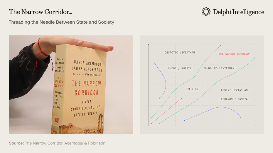 In their 2017 book, The Narrow Corridor, Acemoglu and Robinson argue that crafting correct balance between state authority and societal strength is extremely delicate - with the majority of countries veering off the narrow corridor into authoritarianism on the one side or anarchy on the other.